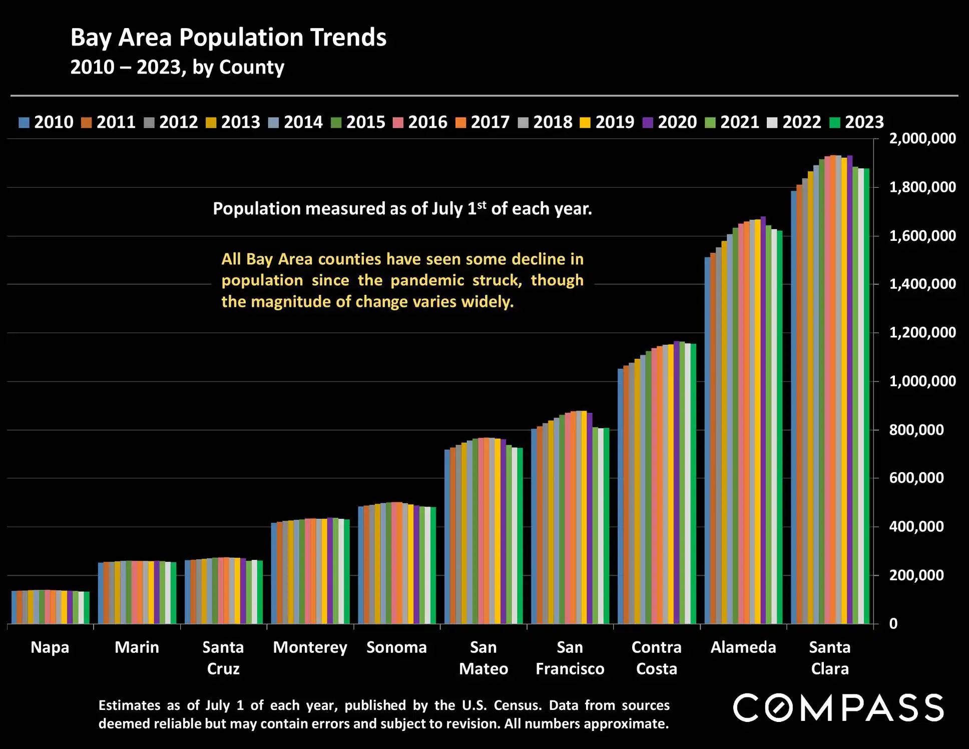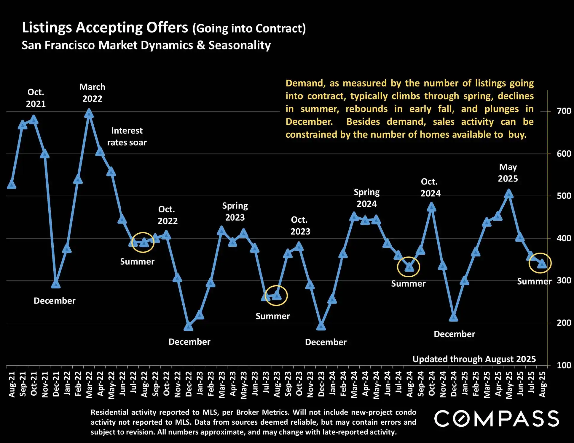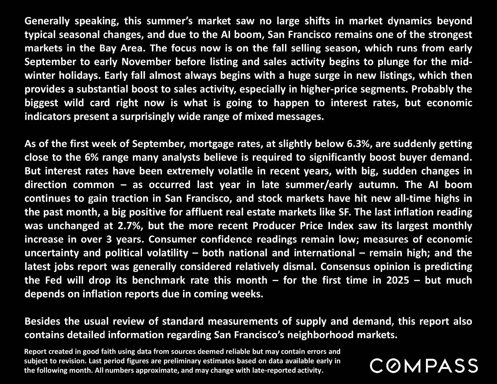 Generally speaking, this summer’s market saw no large shifts in market dynamics beyond typical seasonal changes, and due to the AI boom, San Francisco remains one of the strongest markets in the Bay Area. The focus now is on the fall selling season, which runs from early September to early November before listing and sales activity begins to plunge for the mid-winter holidays. Early fall almost always begins with a huge surge in new listings, which then provides a substantial boost to sales activity, especially in higher-price segments. Probably the biggest wild card right now is what is going to happen to interest rates, but economic indicators present a surprisingly wide range of mixed messages.