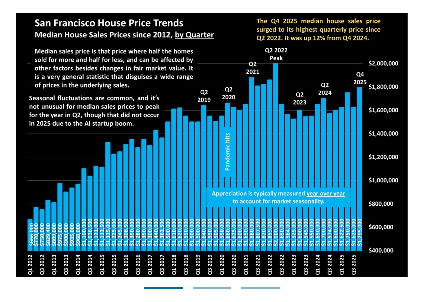 What it means for SF: The market is increasingly split. Trophy homes and best-in-class listings can still command standout prices, while many buyers remain rate-sensitive and selective. If the AI-driven wealth cycle keeps building, San Francisco should remain a highly competitive market through 2026, especially for turnkey, well-located homes that check every box. Rates will influence the speed of decisions, but demand for the best properties is positioned to stay strong.