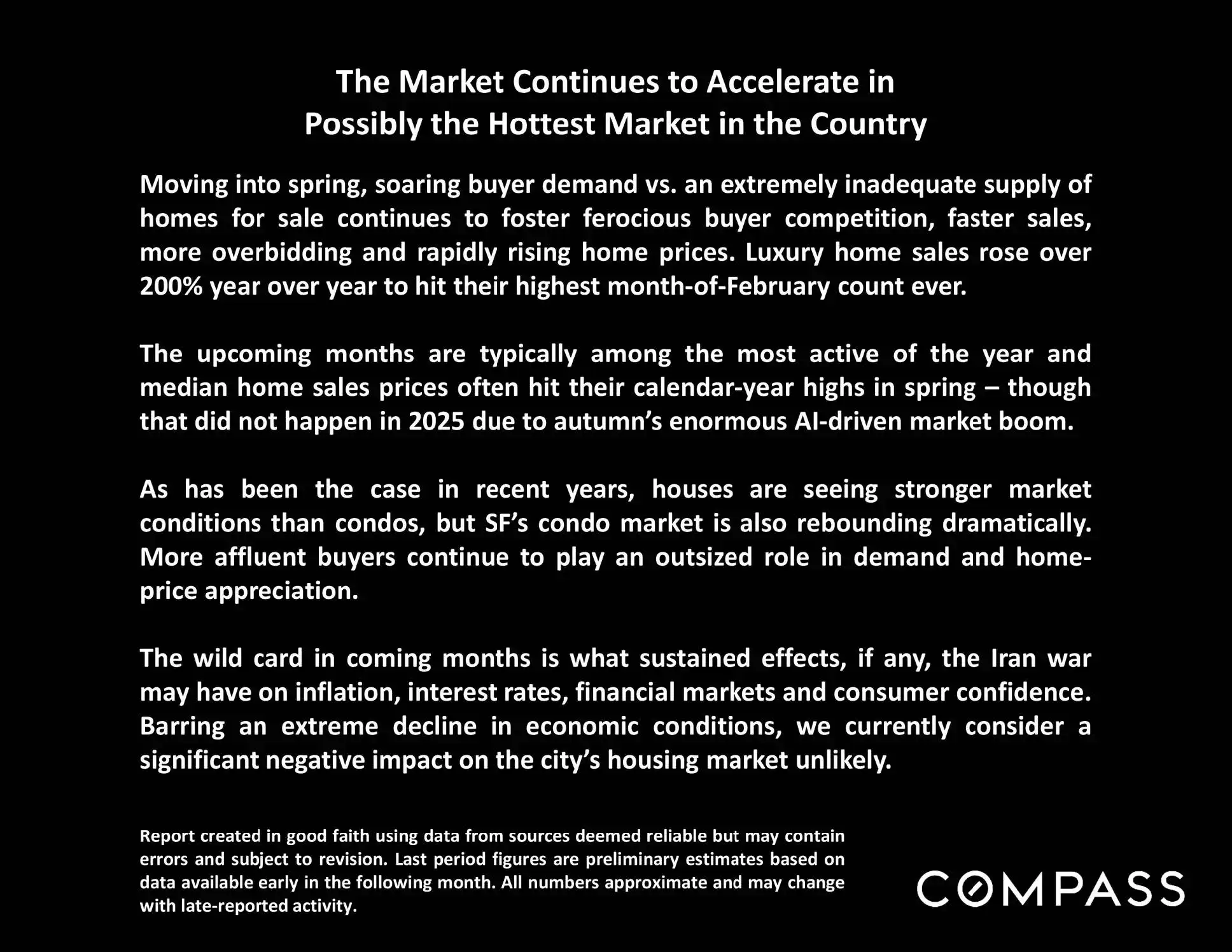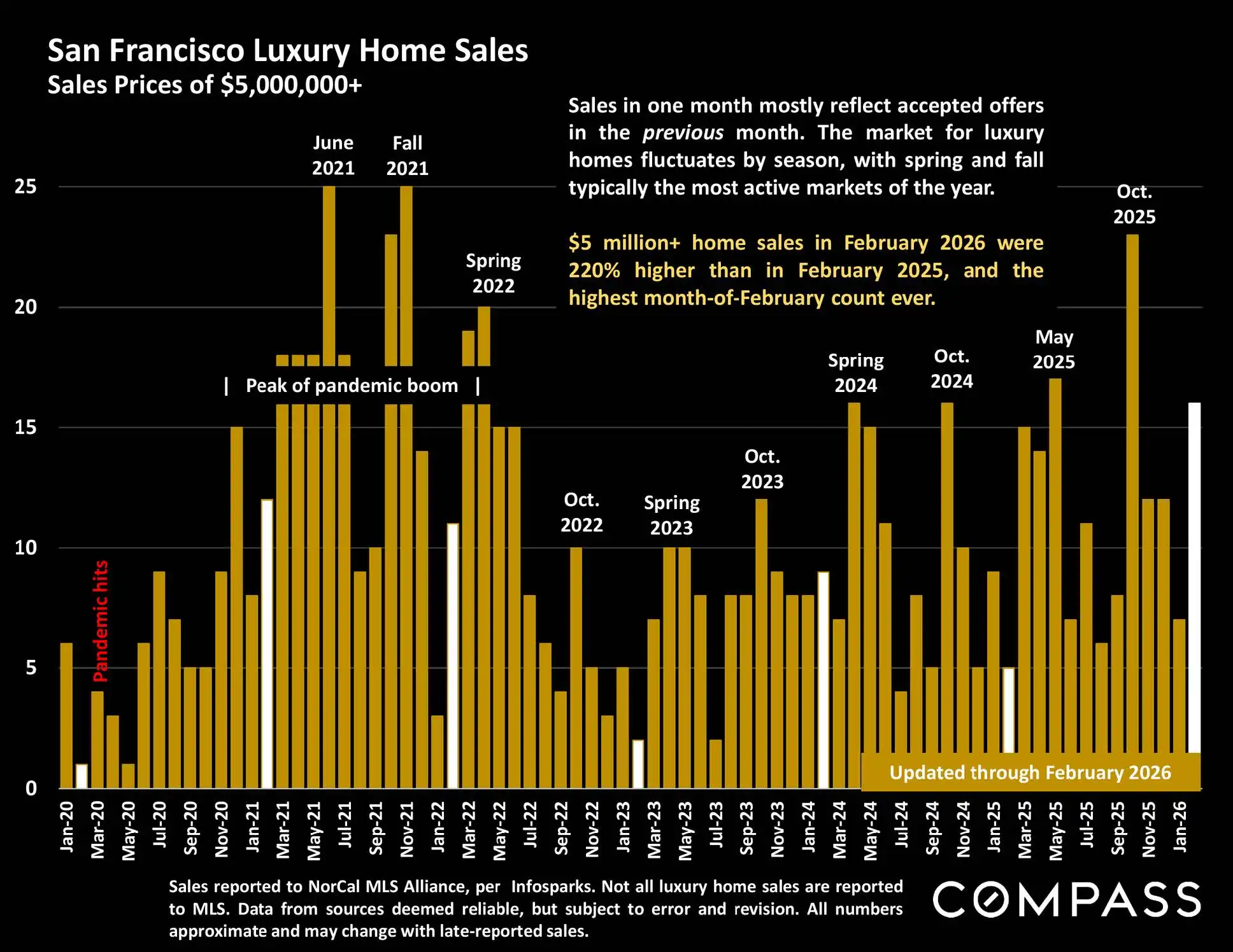 Moving into spring, soaring buyer demand vs. an extremely inadequate supply of homes for sale continues to foster ferocious buyer competition,faster sales, more overbidding and rapidly rising home prices. Luxury home sales rose over 200% year over year to hit their highest month-of-February count ever.