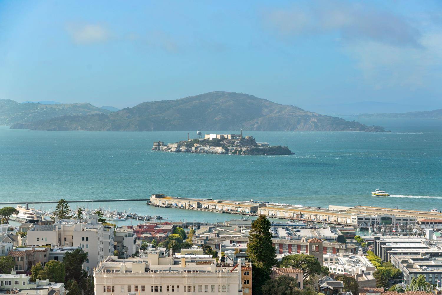 Perched at the top of Russian Hill on a tree lined flat block this spectacular home features quintessential San Francisco Bay, Coit Tower, Golden Gate Bridge, Alcatraz, and stunning water views. This completely renovated 8th floor home was originally designed by Architect Stephen Sutro and painstakingly remodeled with the finest finishes. The previous owner and designer selected wide plank white oak flooring, Calacatta Corchia marble, and paneled walls in the open concept kitchen which look directly over the Bay with near unobstructed views. Upon entering the building's lobby you're greeted by the 24 hour doorman who guides you to one of 2 elevators which take you to the 8th floor which features only 3 homes. This generously proportioned 2 bedroom 2.5 bathroom home is the pinnacle of inspired design with designer light fixtures, bathroom tile/stone, closet design, and appliance selection. Walking distance to dining on Hyde Street, gyms/shopping on Polk Street, Parks, Cafes, and all that San Francisco has to offer. One large deeded parking space with gated 24/7 access and deeded storage included.