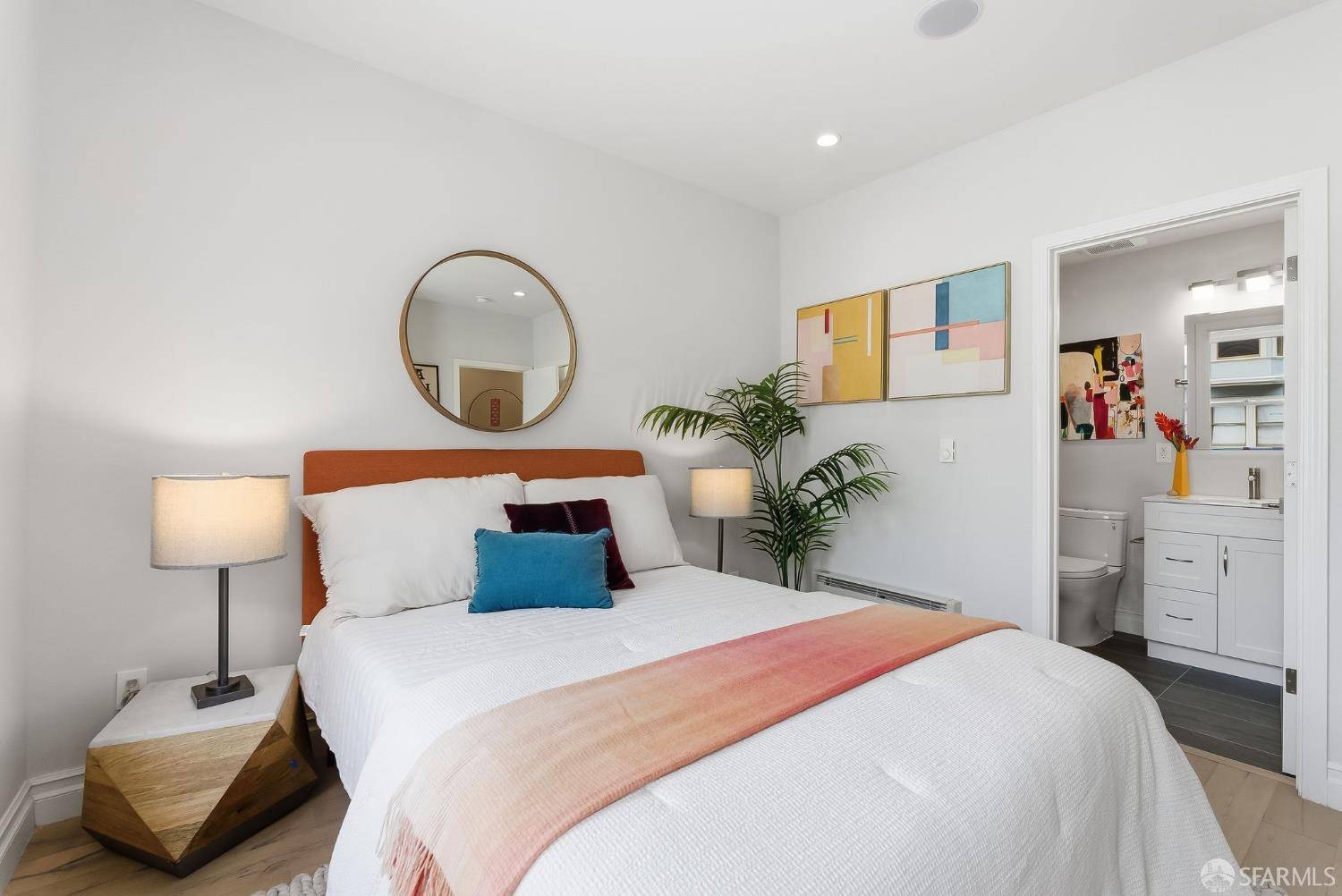 Located on the first floor of a boutique Telegraph Hill TIC, this updated 2BD/2BA full-floor home blends modern comfort with an unbeatable San Francisco address. The residence features hardwood floors, stainless steel appliances, quartz countertops, designer tile, in-unit laundry, keyless entry, and generous closet space. The primary bedroom includes an ensuite bath, complemented by a spacious second bedroom and full guest bath. Recent building upgrades include a new foundation with voluntary seismic reinforcement, updated electrical and plumbing throughout, new sewer lateral, double-pane windows, and a 400-amp electrical service. Residents also enjoy a refreshed shared backyard and dedicated private storage. From select outlooks, the home offers partial views of the Bay and the Transamerica Pyramid. Ideally situated near Safeway, cafes, dining, nightlife, Downtown, and Jackson Square.
