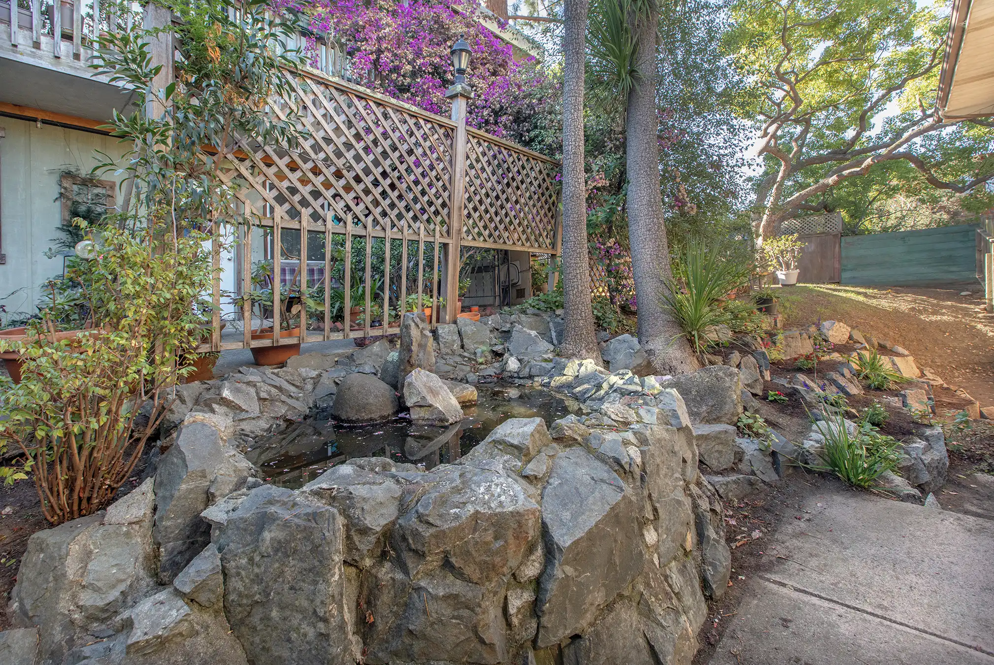• Private deck overlooking lush shared backyard with tranquil fountain and mature landscaping