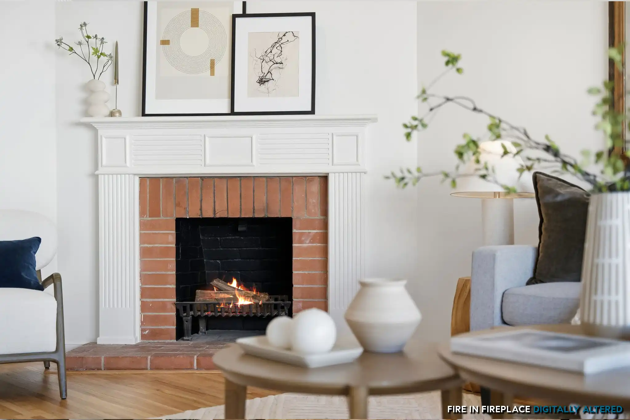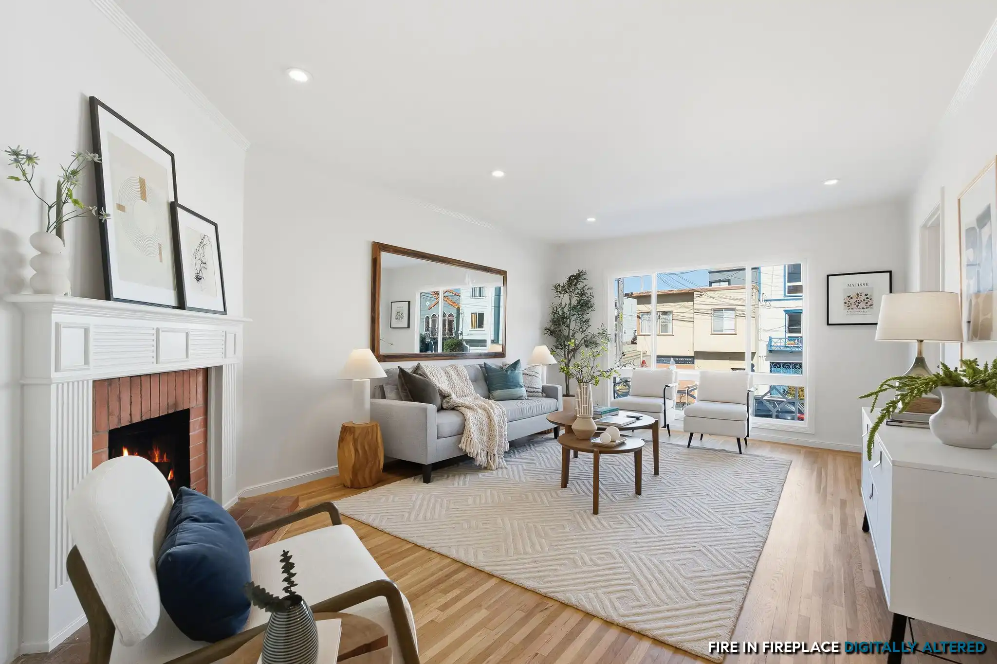 - Inviting living room anchored by a warm brick fireplace and separate dining area