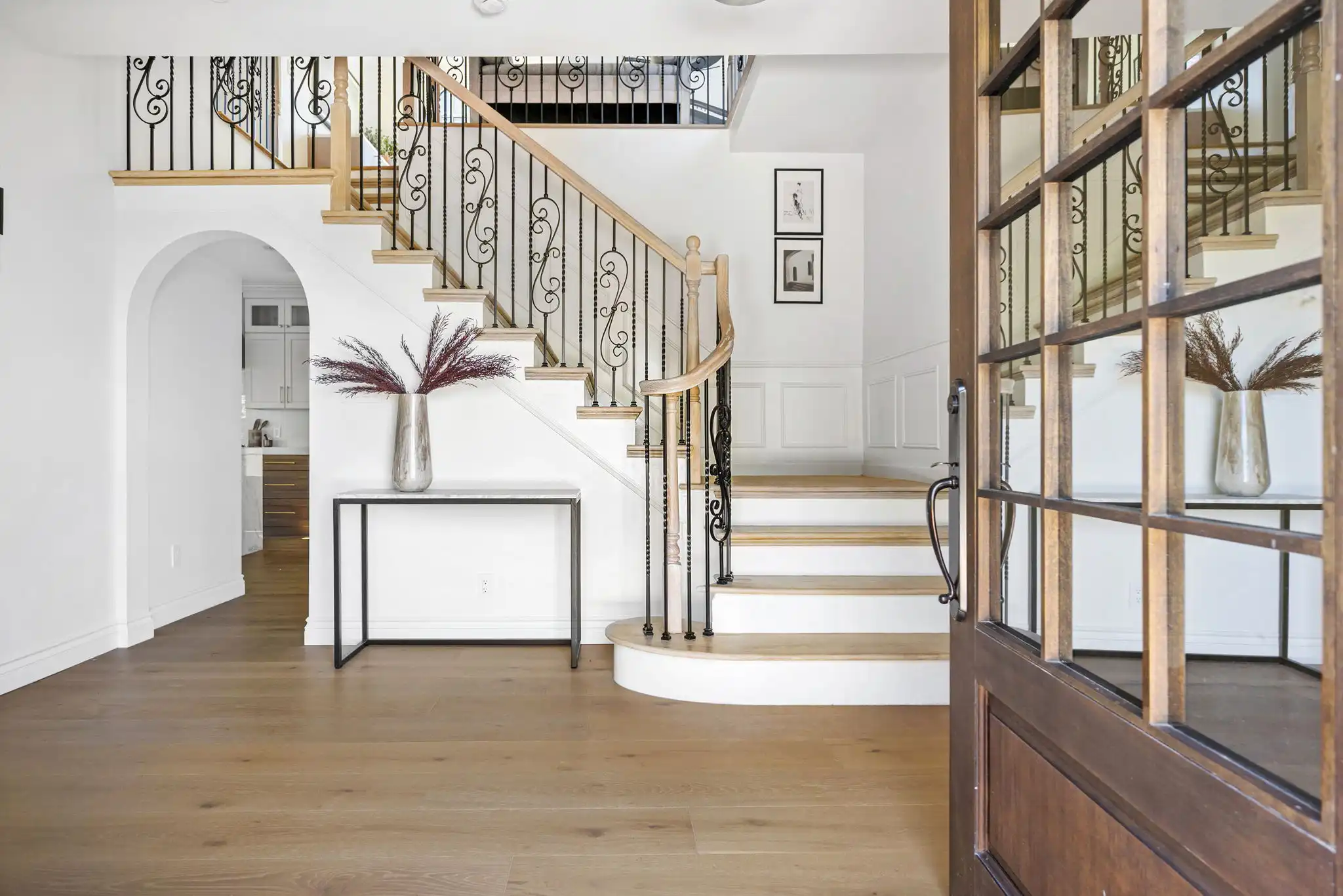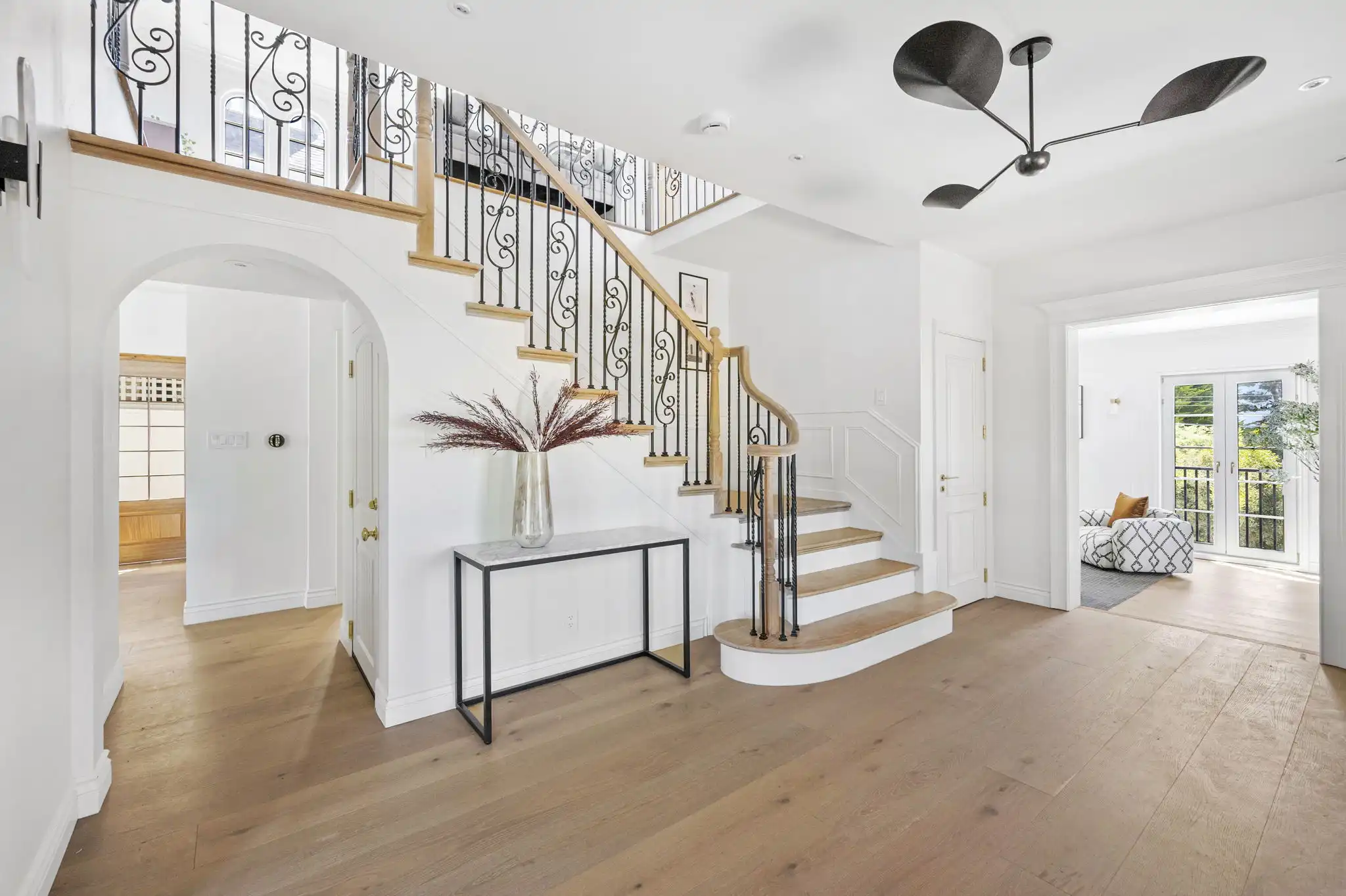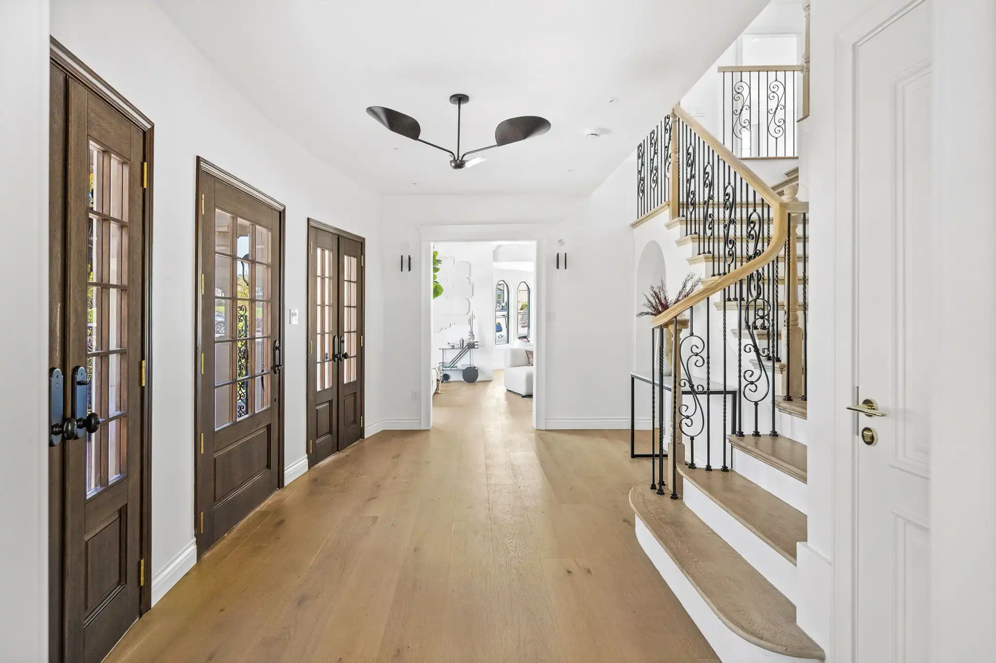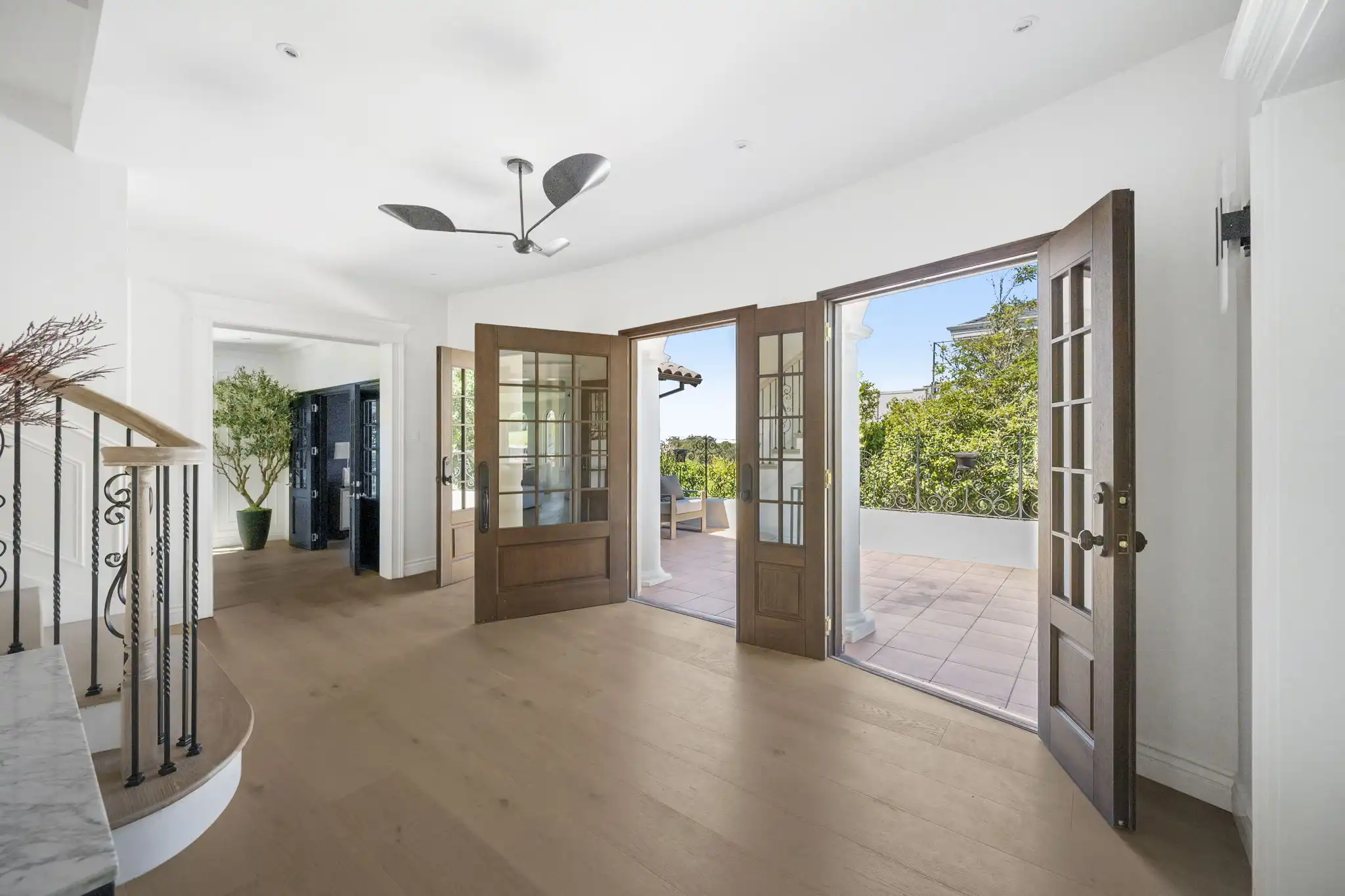 - Dramatic foyer with soaring ceilings, French doors, and custom rolling staircase