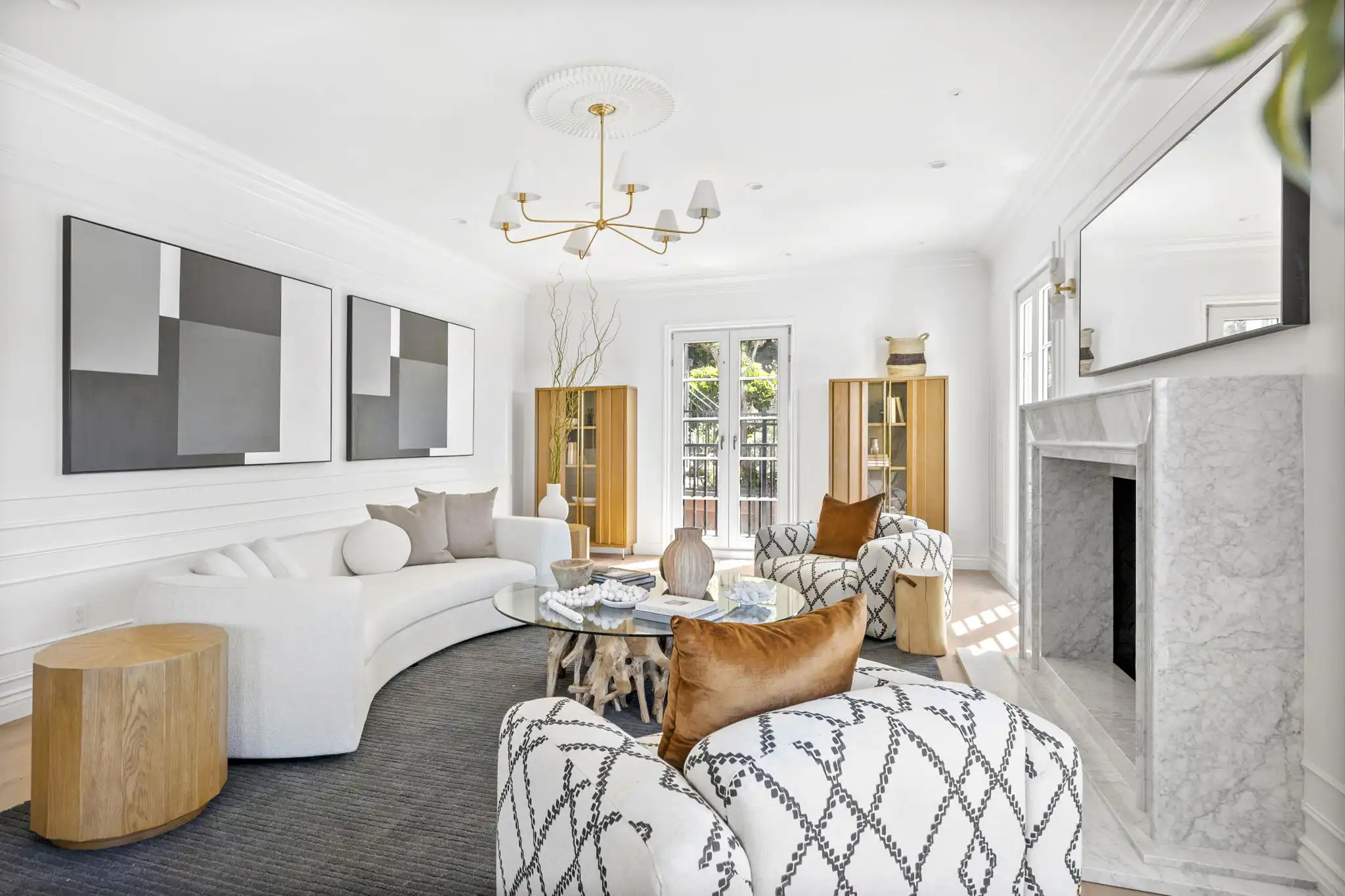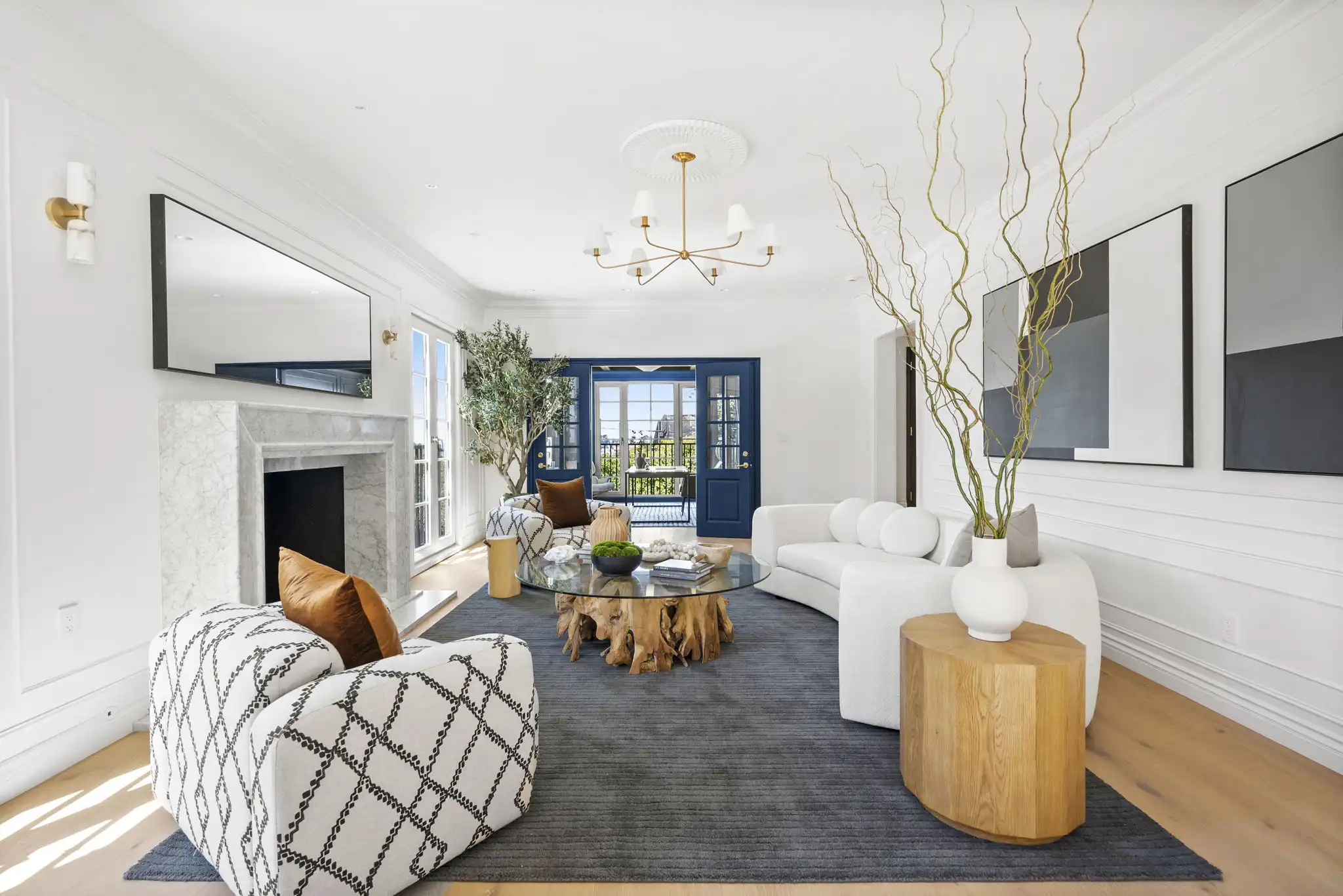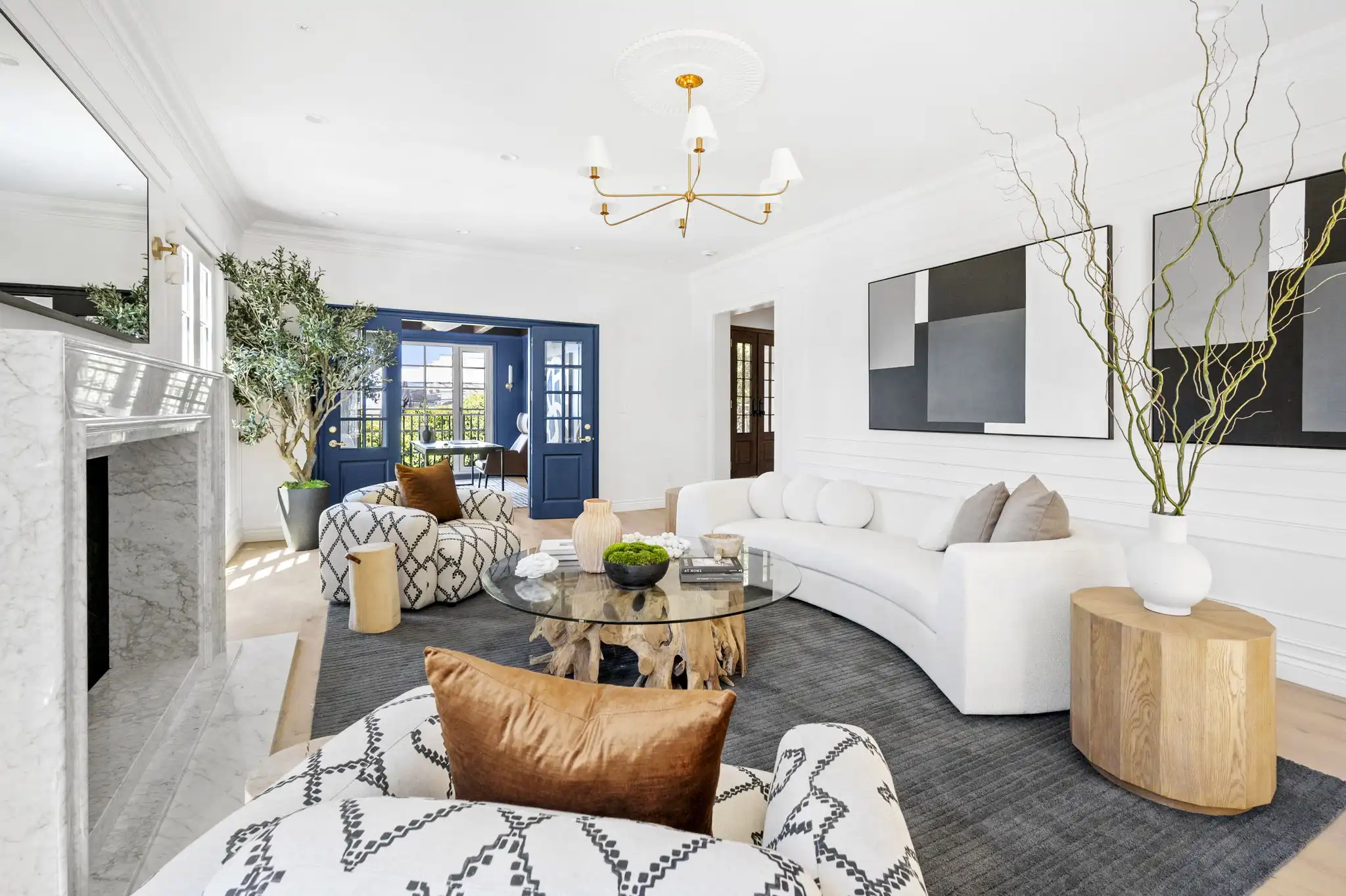 - Formal living room with custom Calacatta marble fireplace and attached office/den
