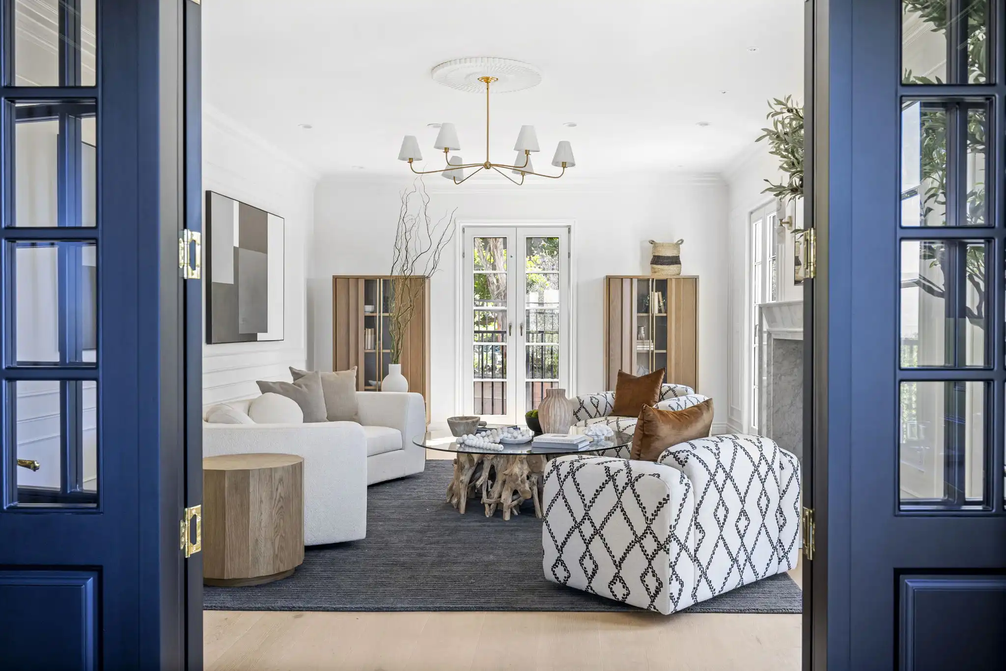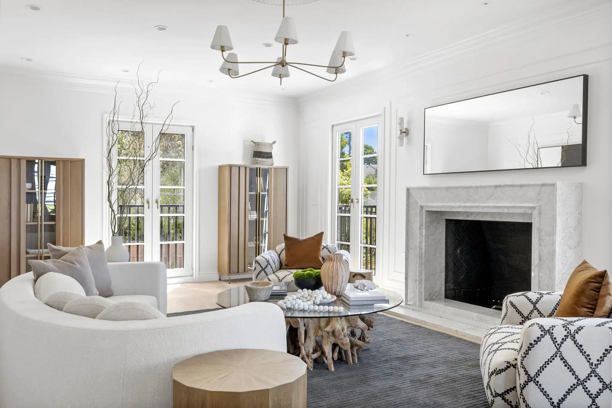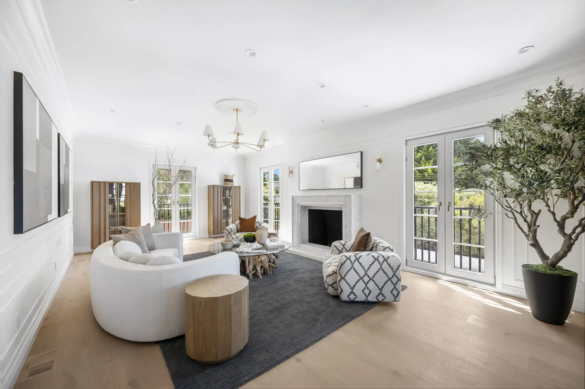- Formal living room with custom Calacatta marble fireplace and attached office/den