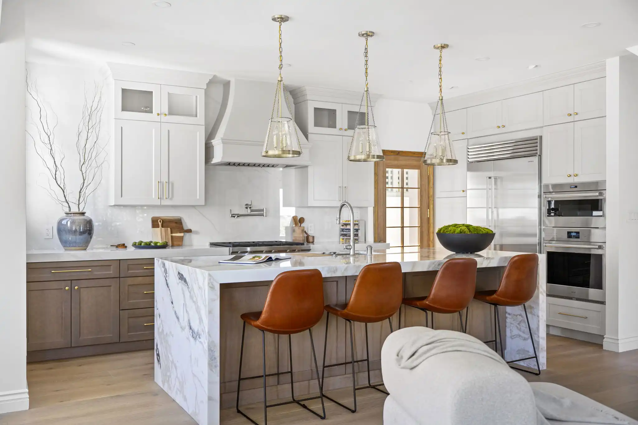 Step through the striking solid-wood entry doors into luminous, open-concept spaces with soaring ceilings and sweeping sightlines. At the heart of the home, a spectacular great room unites a chef’s kitchen, dining area, and casual living space—perfect for both entertaining and everyday living. The gourmet kitchen features Omega custom cabinetry, a professional-grade Wolf range with dual wall ovens, Sub-Zero refrigeration, and expansive dove-white Italian marble countertops. Designer details like Perrin & Rowe handcrafted faucets and a dramatic custom Calacatta marble fireplace add a touch of timeless elegance.
